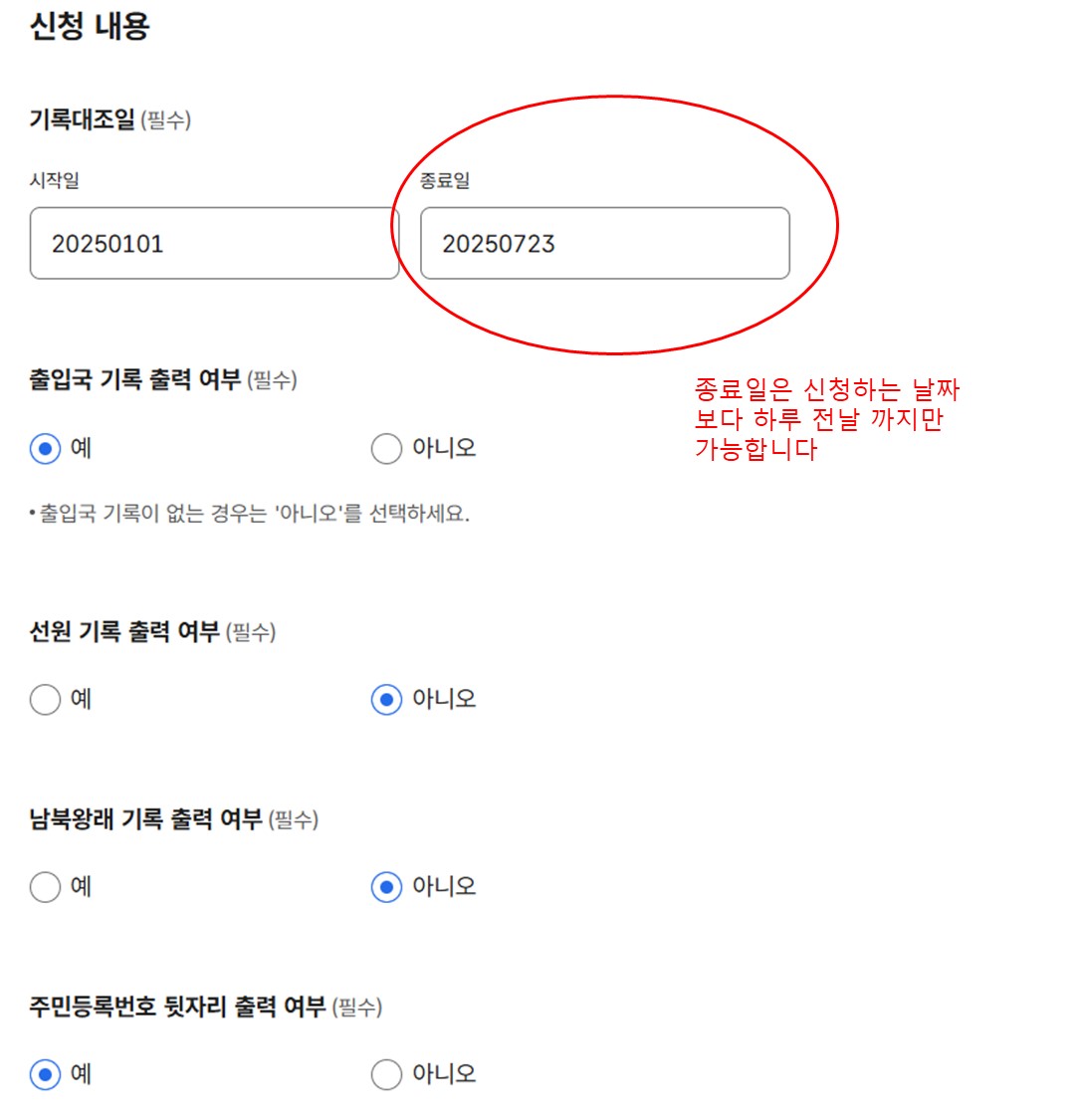 여기서 주의사항은 기록대조일 종료일은 신청일 기준 하루 이전의 날까지만 조회가능합니다