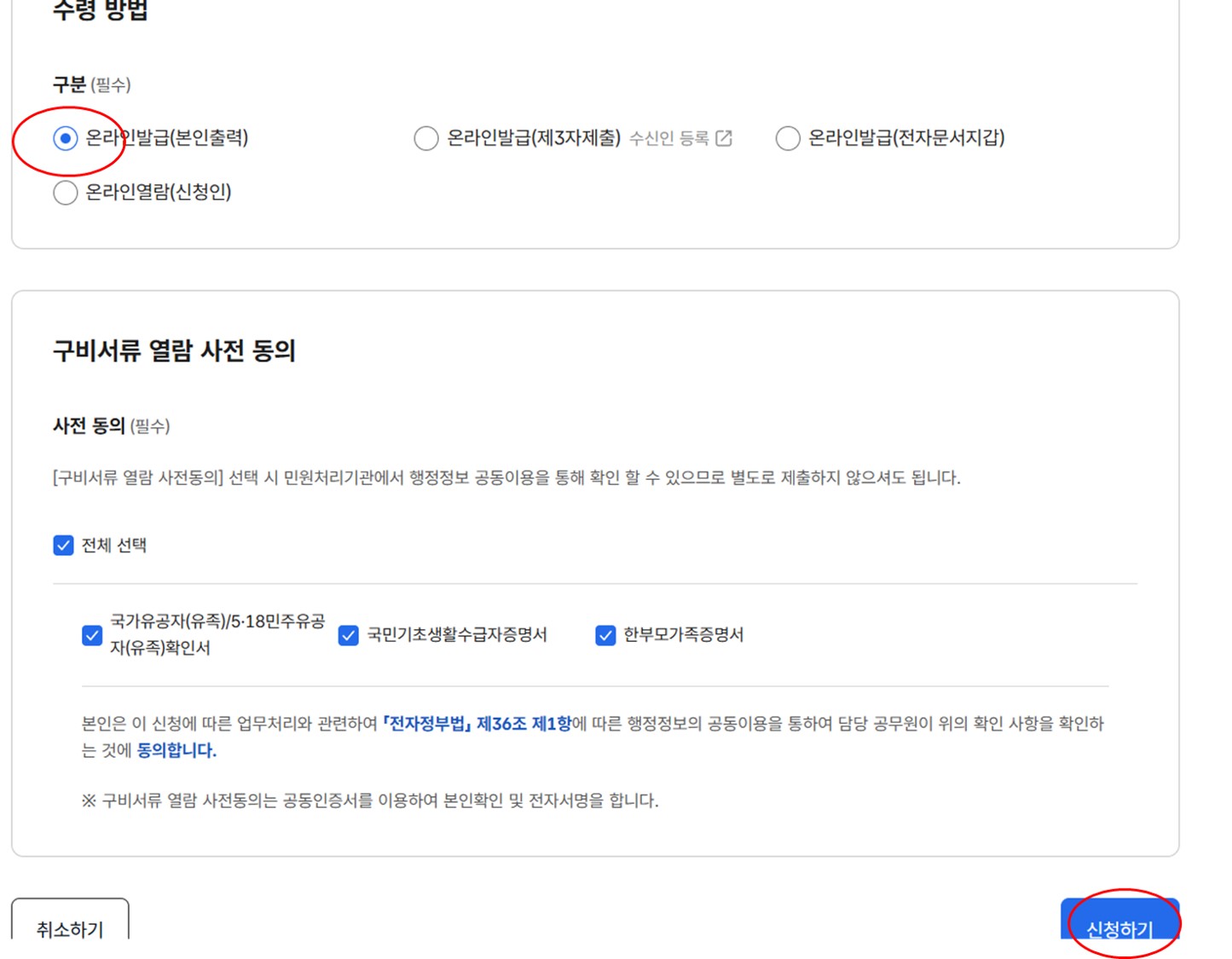 수령방법은 온라인발급 (본인출력)으로 하셔야 프린트로 출력가능합니다