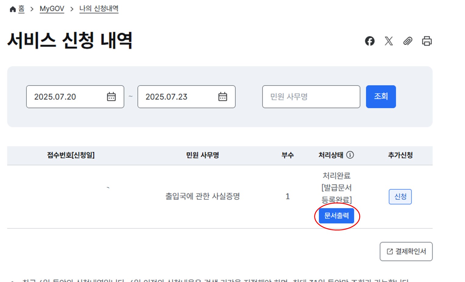 문서출력 클릭해주시면 신청한 민원 내용이 새창으로 팝업됩니다.