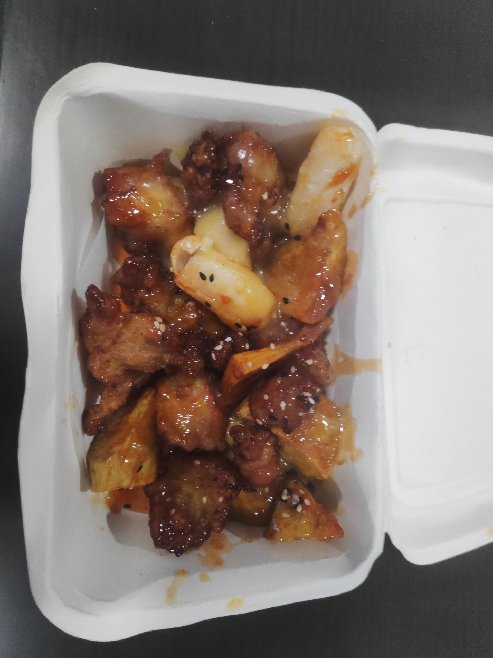 닭강정, 고구마, 떡 이렇게 되있고 치즈는 잘 보이지 않네요.