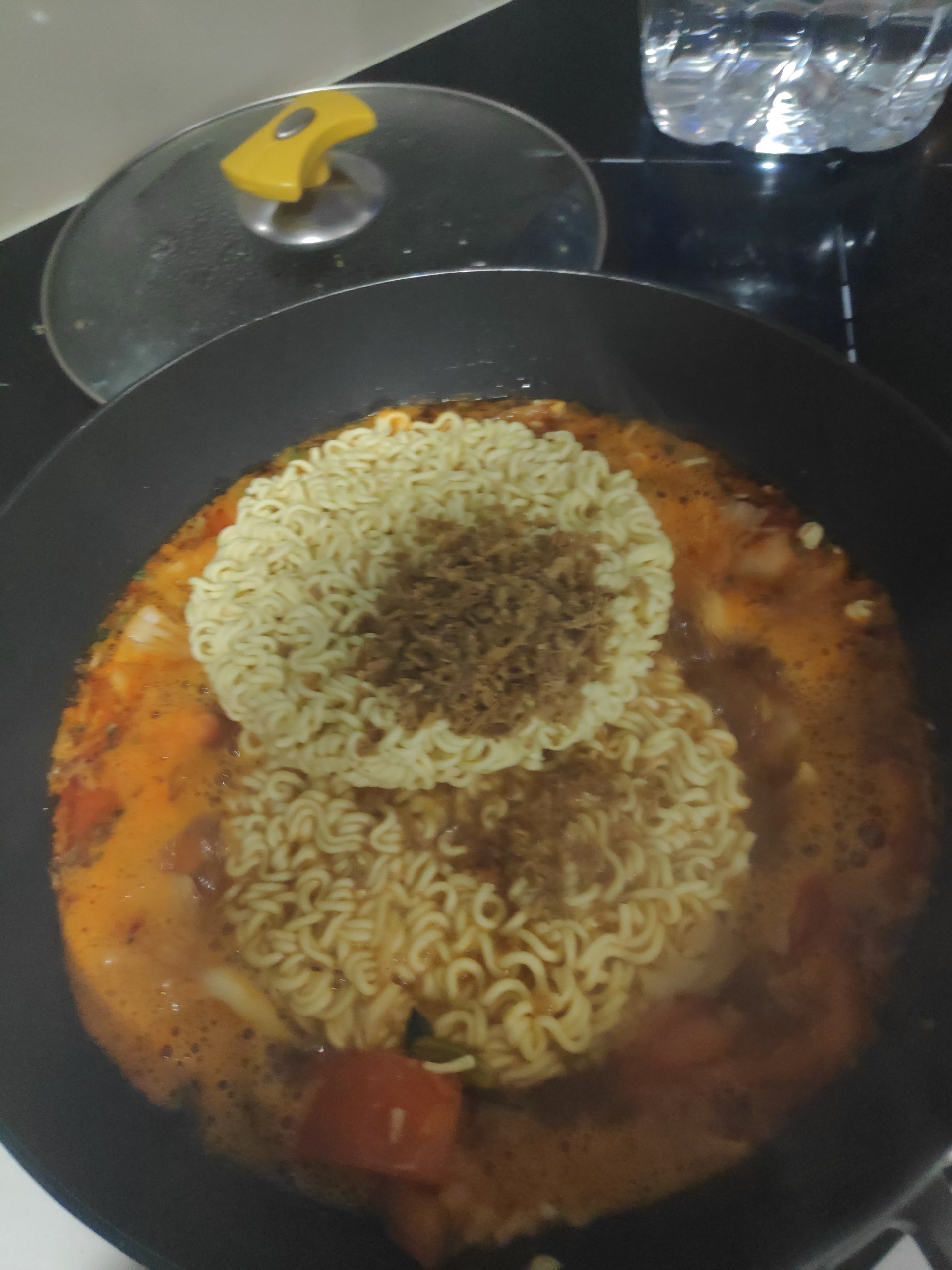 어느정도 색이나면 라면스프를 같이 넣어 볶다가 물을넣고 물이끓으면 라면을 넣어주세요