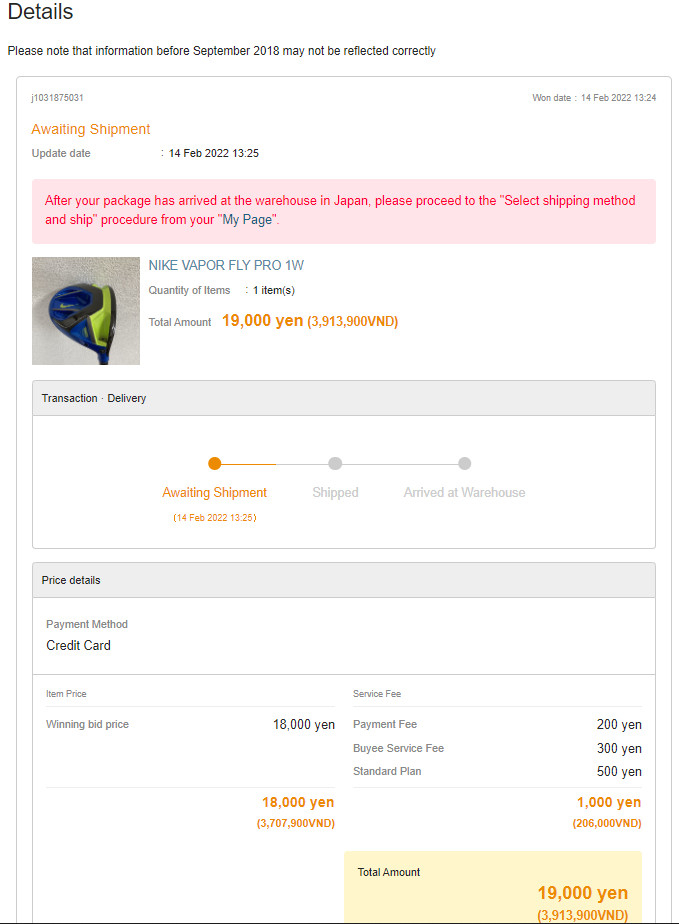 Step 3 : 경매대상인 상품은 Place Bid 후, 경매 결과를 기다리고, 즉시구매가능한 상품은 바로 구매 누르면 끝 낙찰받으면 이렇게 낙찰 상품에 상품정보가 뜬다. 해당가격은 상품가격+ 내륙배송비 + Buyee 서비스피가 포함된 가격이며 아직 국제 배송비는 미포함되어있다.