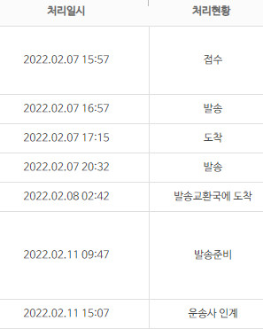 2월 11일 운송사 인계가 떳지만 벌써 1주일이나 지났는데도 아직 그대로이다.