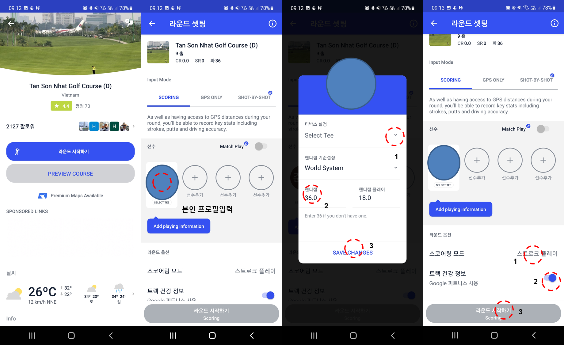 이렇게 세팅을 해놓고 필드에가서 라운딩 시작 버튼을 누르면 이렇게 코스 정보가 뜨고,