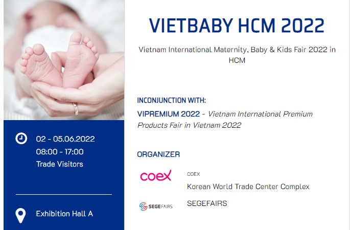 2022년 6월 2일 금요일부터 6월 5일 일요일까지 호치민 7군 SECC (사이공컨벤션센터)에서 베트남 베이비 페어와 프리미엄 상품 페어가 열린다고하네요.