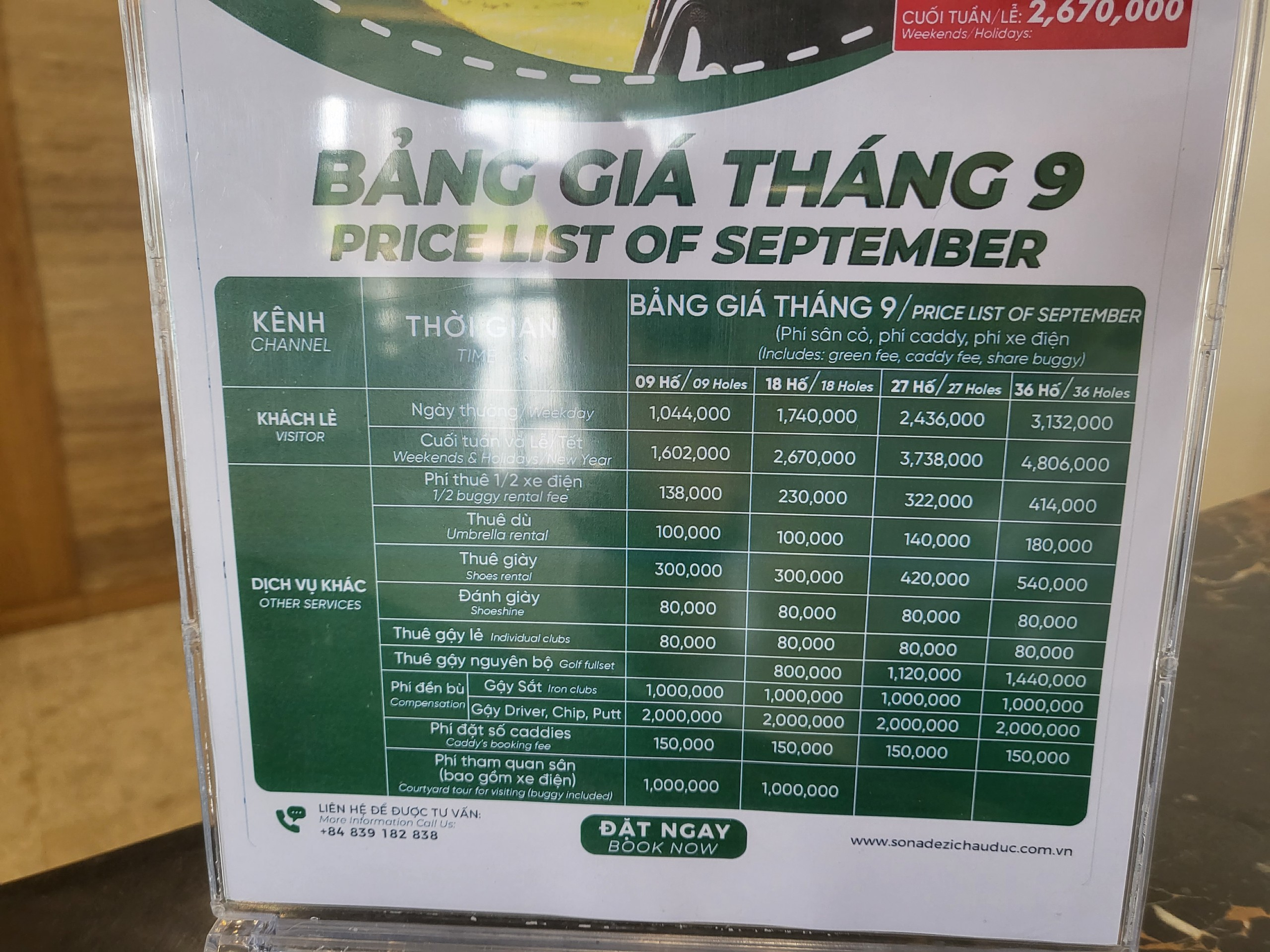 9월 프로모션 가격으로 평일 1,760,000 VND (그린, 캐디, 버기, 생수 2, 샌드위치 1 포함) 주말 2,670,000 VND